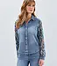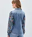 Button down, raw edge hem, colorful sleeves with denim cuff and shirt collar jo..
