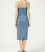 A fitted denim midi dress with a button-front design and adjustable spaghetti straps. Made from low-..